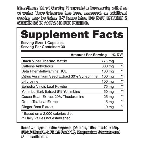 Black Viper es un producto termogénico y energético de alta potencia que está diseñado para ayudarle a aumentar la quema de calorías que conduce a la pérdida de grasa acelerada cuando se utiliza junto con una dieta adecuada y programa de entrenamiento.
