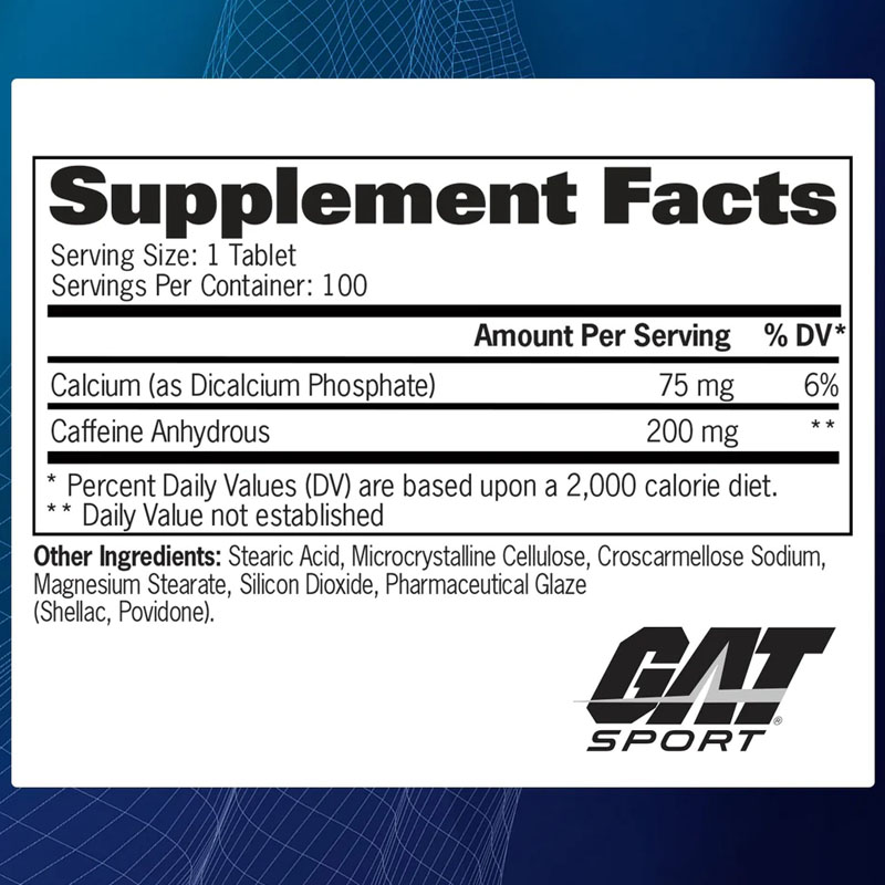 La cafeína proporciona efectos energizantes con cero azúcar añadido o calorías para apoyar tus necesidades de entrenamiento sin comprometer tus objetivos dietéticos. La cafeína desencadena los siguientes beneficios específicos que apoyan a tu rendimiento, enfoque mejorado, alerta elevada, tiempo de reacción más rápida, menor fatiga y mayor resistencia. Las tabletas de GAT CAFFEINE te brindan una oleada de 200mg de cafeína en cualquier momento que lo necesites, para acelerar rápidamente tu desempeño mental y físico con el fin de maximizar tu entrenamiento.